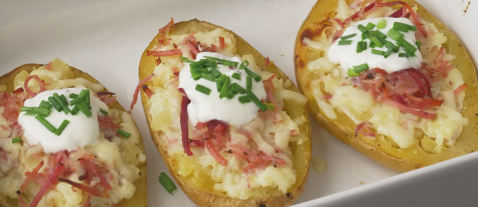 Farcisci le patate svuotate con il ripieno, poi distribuisci sulla superficie il formaggio rimasto e qualche stick di speck.