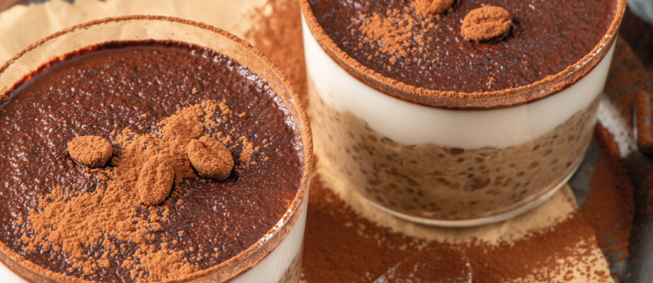Versa lo yogurt Bella Vita Free bianco senza lattosio in una ciotola capiente, poi aggiungi i semi di chia, una tazza grande di caffè già freddo e dolcifica con sciroppo d’acero secondo il tuo gusto.